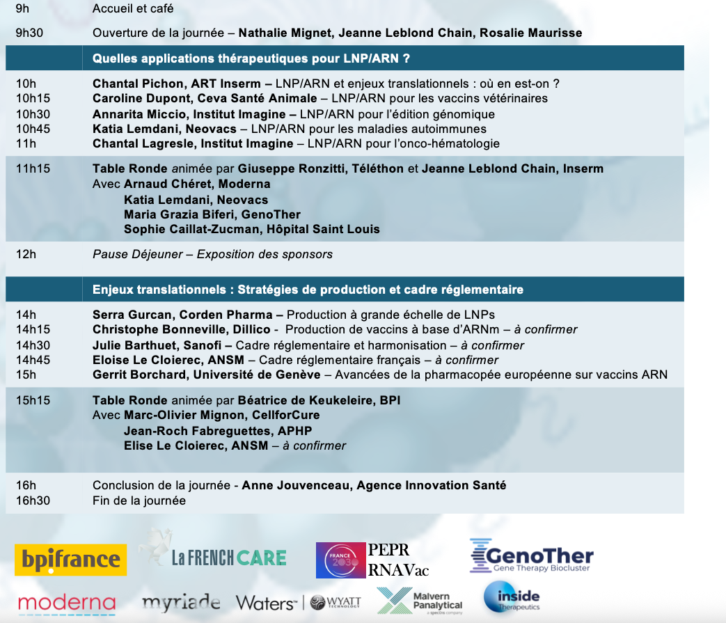 The goal of this meeting is to bring together active leaders of LNP/RNA in France, to gather academic and industrial partners and to discuss therapeutic applications of LNP/RNA and translational challenges.